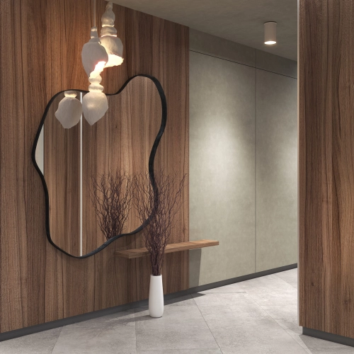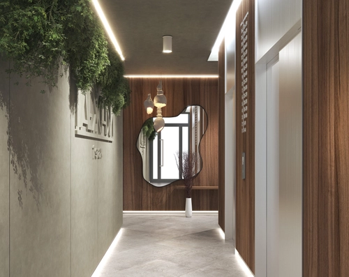 Дом строится по монолитно-кирпичной технологии. Всего два подъезда, на каждом этаже — по четыре квартиры. Фасады спокойные, с натуральными акцентами.