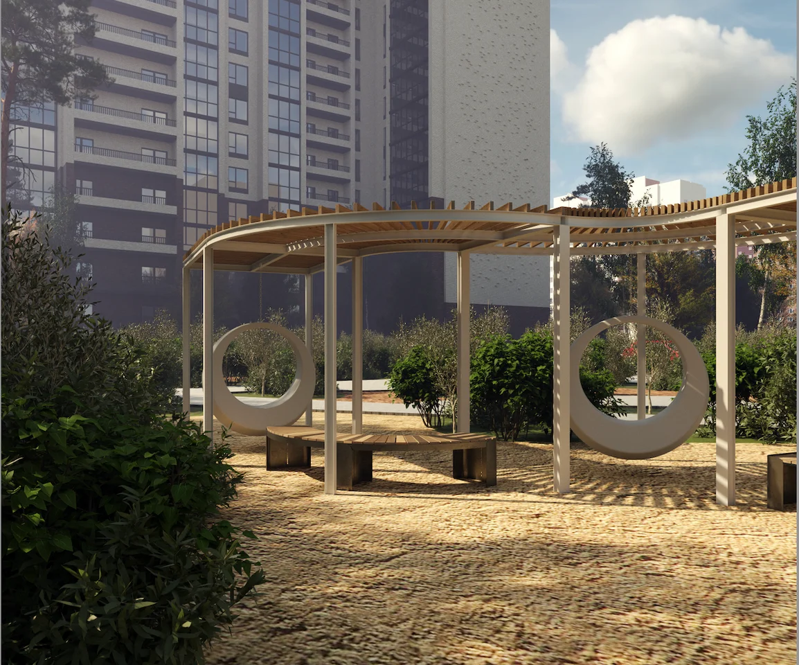 Территория полностью закрыта от автомобилей. Двор — только для людей. Здесь появятся зелёные зоны, детские и спортивные площадки, лавочки и освещение. Для машин предусмотрен тёплый подземный паркинг на 73 места. В подъездах — широкие входные группы без ступеней, два лифта на секцию, предусмотрены колясочные и видеонаблюдение.
